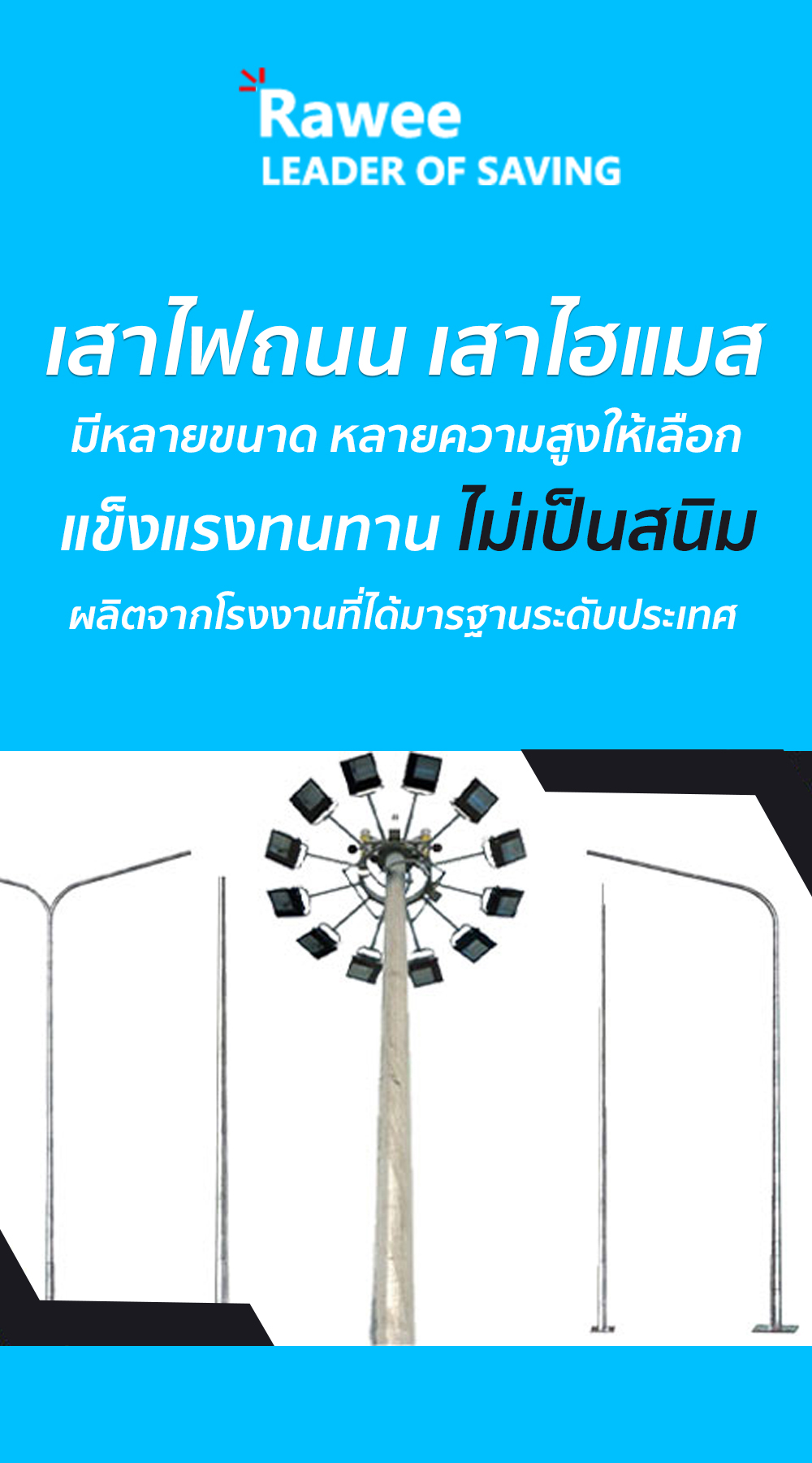 แต่โรงงานของเราเลือกใช้ วัตถุดิบคุณภาพสูง ผลิตตามมาตรฐานจริงทุกขั้นตอน ทำให้ลูกค้ามั่นใจได้ว่าเสาไฟที่ได้รับจะใช้งานได้ยาวนาน แข็งแรง และคุ้มค่ากับการลงทุน