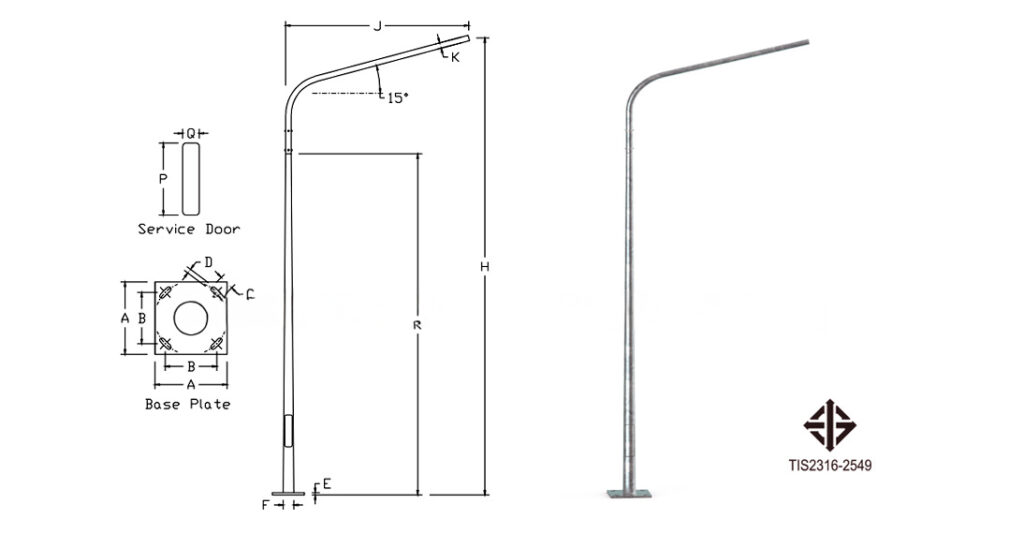 เสาไฟถนน ตัวเสาเหล็กมีการชุบกัลวาไนท์อย่างดี ปลอดสนิมตลอดอายุใช้งาน ใช้สำหรับติดตั้งโคมไฟภายนอกอาคาร