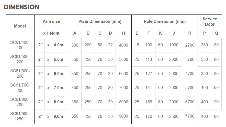 • ความสูงเสามีให้เลือกได้ตั้งแต่ 4-12 เมตร สูงสุดถึง 14เมตร